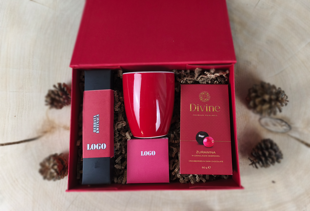 W środku znajduje się kubek ceramiczny z możliwością personalizacji. To klasyk, który nigdy się nie nudzi, szczególnie jeśli jest dobrze zaprojektowany. Na kubku można umieścić logo firmy, motyw graficzny lub subtelny wzór nawiązujący do identyfikacji wizualnej. Taki kubek zostaje z obdarowaną osobą na długo – w biurze, w domu, w codziennym użytkowaniu.