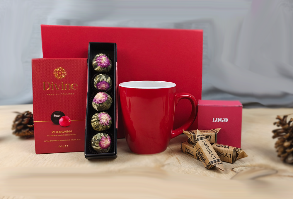 Drugim elementem zestawu jest pudełko z kwitnącymi herbatami, również z możliwością nadruku. To produkt, który robi duże wrażenie wizualne – po zalaniu gorącą wodą herbata „rozkwita” w filiżance, zamieniając zwykły napar w mały rytuał. Personalizowane pudełko stanowi świetną przestrzeń na komunikację marki i delikatne przesłanie.