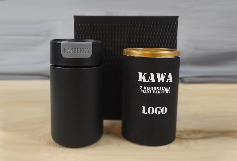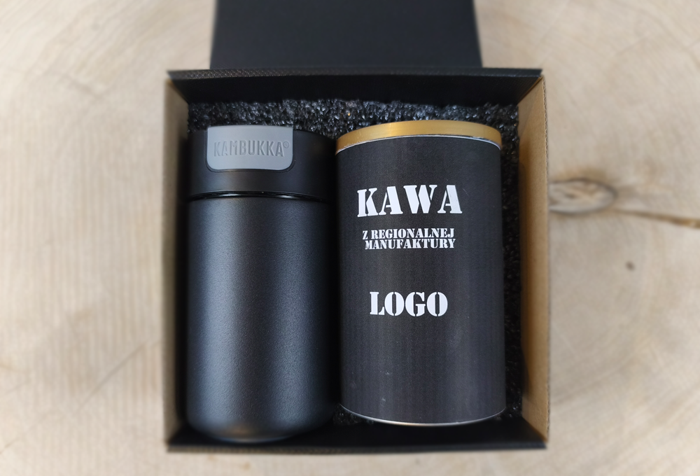 Elegancki zestaw reklamowy z kubkiem termicznym Kambukka 300 ml i kawą z regionalnej manufaktury w personalizowanej tubie. Pudełko oraz zawartość dostępne w różnych kolorach, z możliwością znakowania: grawer z kolorową podkładką CMYK lub złocenie. Idealny prezent firmowy. Minimalne zamówienie: 100 sztuk.