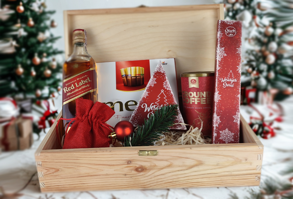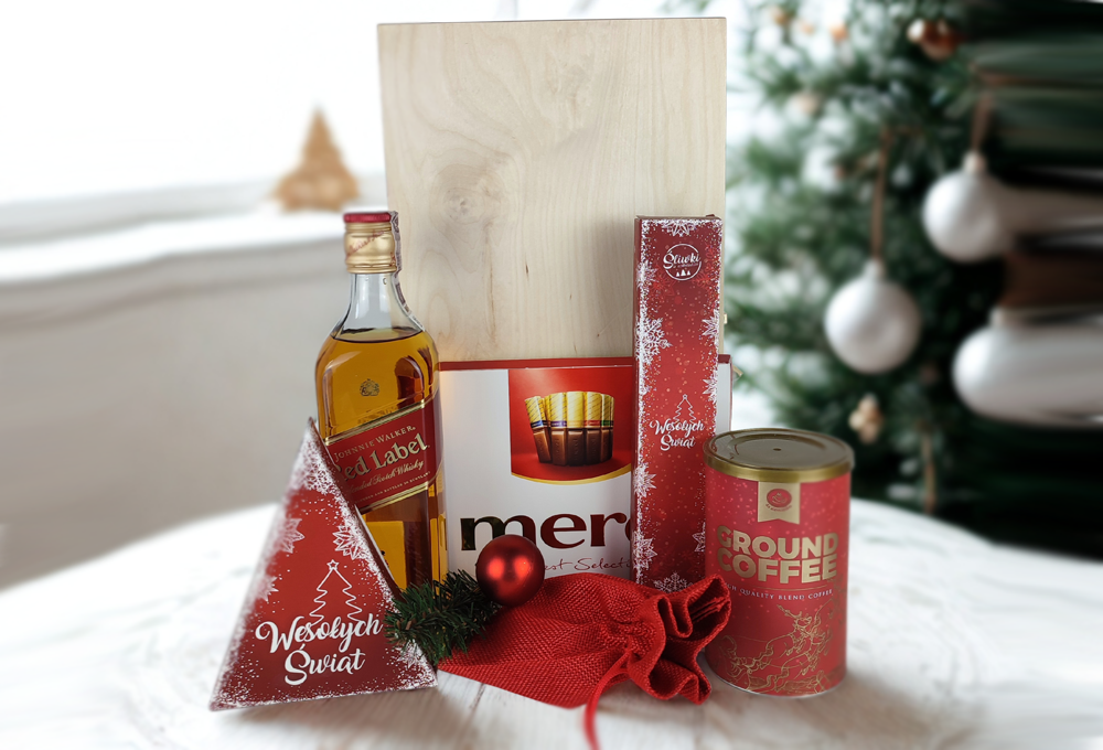 Elegancki zestaw świąteczny dla firm w drewnianej skrzynce obejmuje whisky Johnnie Walker Red Label, aromatyczną kawę w tubie, tradycyjny pierniczek, śliwki w czekoladzie z regionalnej manufaktury, bombonierkę Merci oraz praliny Michałki w jutowym woreczku. Gotowy do wręczenia prezent premium podkreśla prestiż marki, buduje relacje i sprawdza się dla pracowników oraz kontrahentów. Eleganckie wykończenie i naturalne drewno robią naprawdę świetne wrażenie.